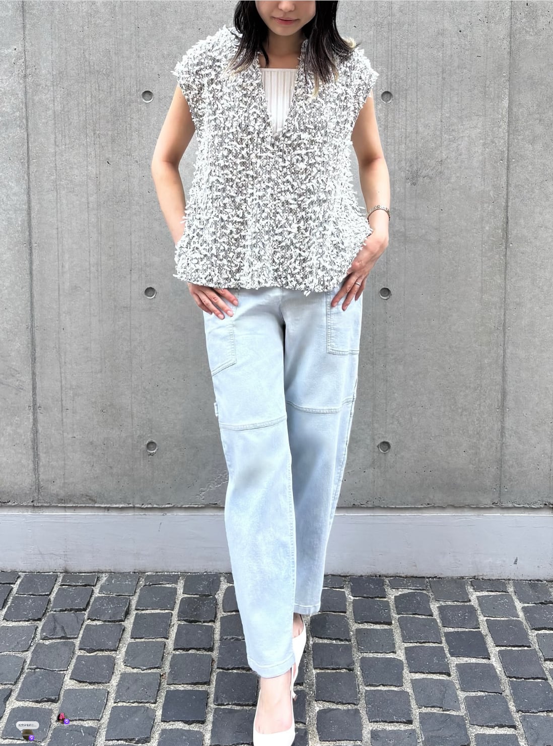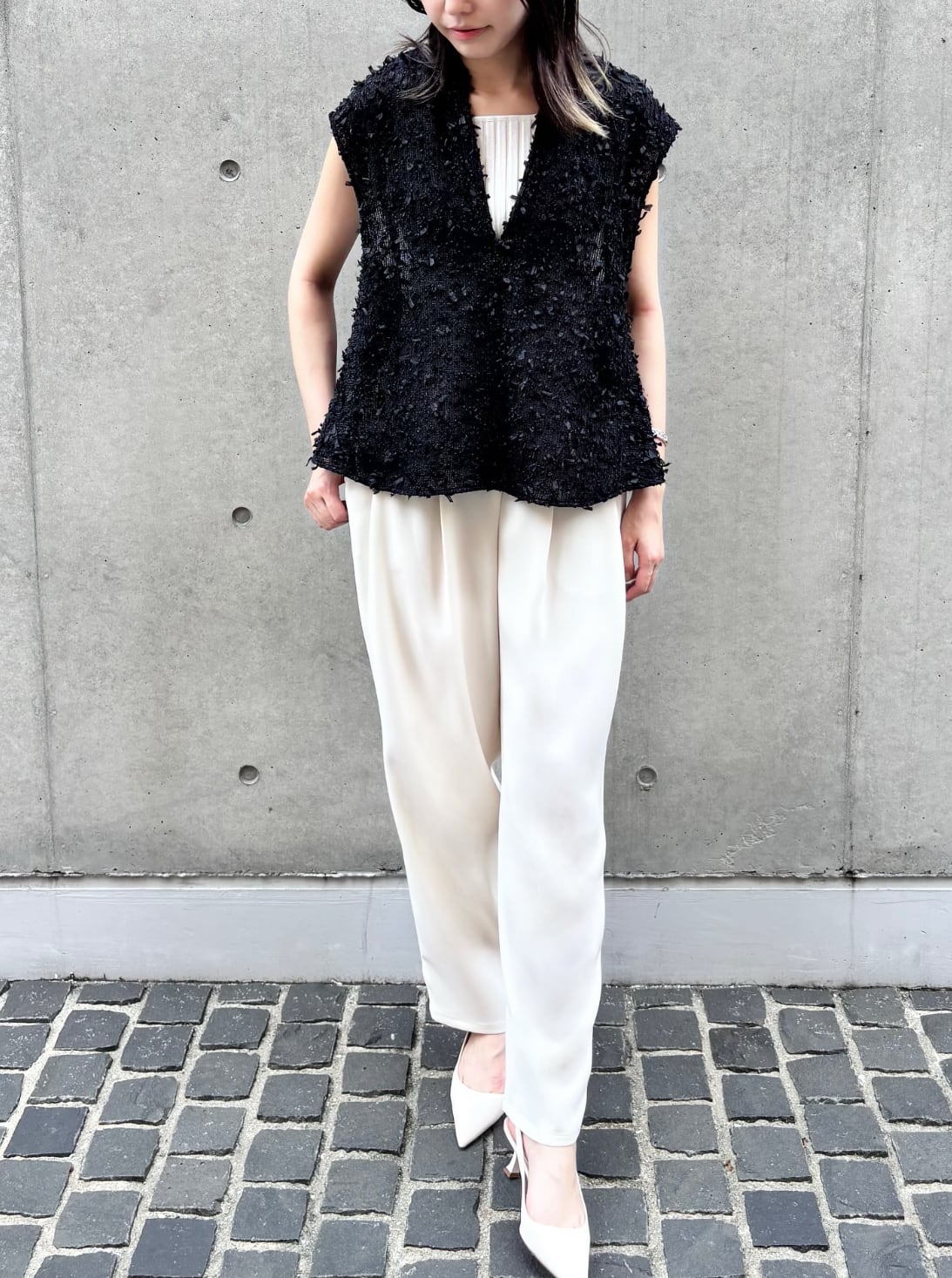 秋はtシャツやブラウス、冬はニットなどにレイヤードとして、ロングシーズン着用できます。